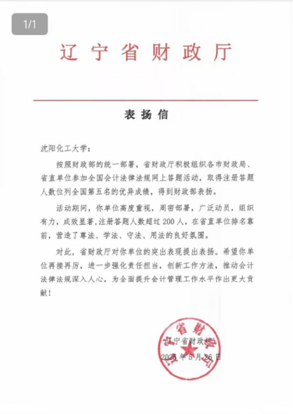 日前,辽宁省财政厅向我校304永利集团官网入口发来表扬通知,对该院精心组织并扎实推进的会计法律法规专题学习及网上答题活动给予高度评价和表扬。省财政厅特别指出,学院对此项活动高度重视,周密部署,广泛动员,组织有力,成效显著,在省直单位排名靠前,营造了尊法、学法、守法、用法的良好氛围。