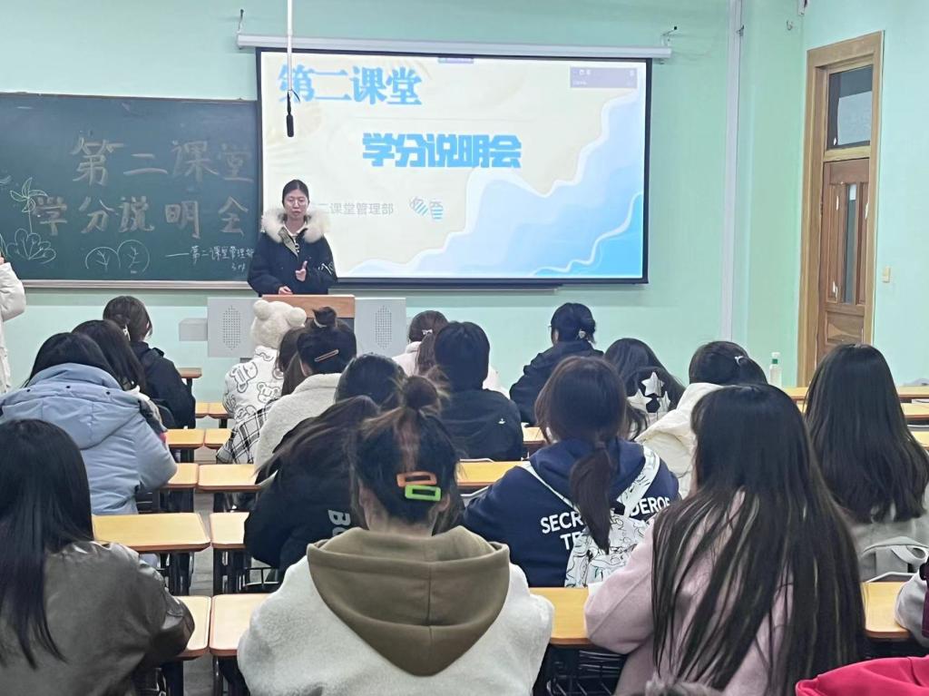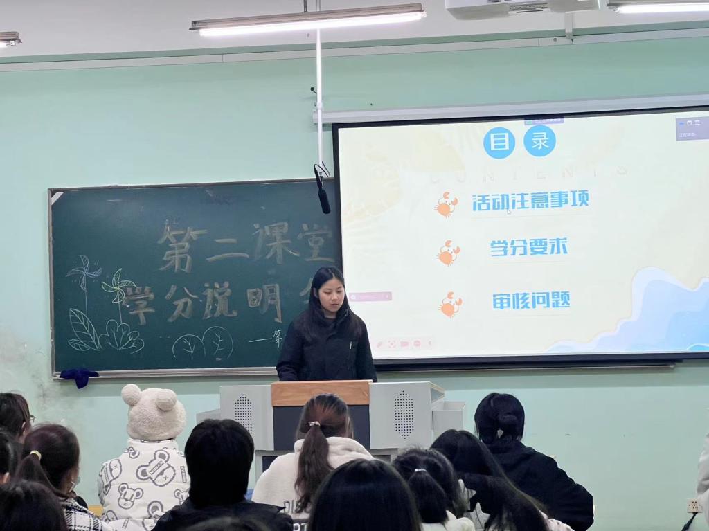 随后,主讲人就第二课堂成绩单的项目管理与组织运行进行了详细的讲解并就活动的申报与录入做了补充说明。第二课堂活动类型包括思想成长、社会实践、创新创业、文体健康、社会工作、技能培训等六大类,每个项目模块在参与结束后,均有对应的分值统计。学院在校指导委员会的指导下,成立了“第二课堂成绩单”制度实施工作组,负责学院“第二课堂成绩单”课程项目设置、子账号分配与管理、信息审核、活动发布、第二课堂成绩单打印等工作。活动共分集体和个人两种,学生们需要在“到梦空间APP”里进行申请,待学院、学校依次审批通过之后活动方可进行开展,并在活动结束后录入成绩。针对特殊情况如退伍兵学生和账号发生异常等,学校会定期批量补录。