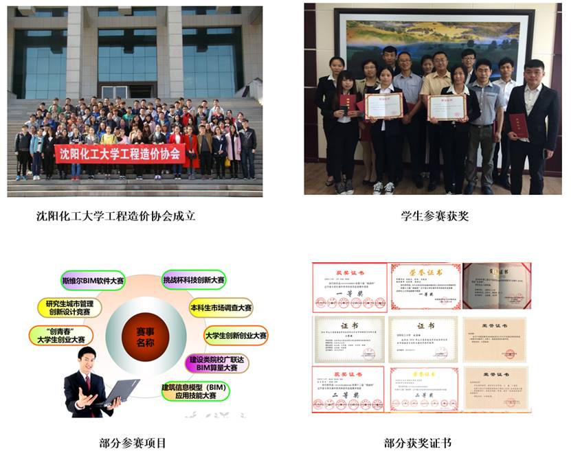 2013年,依托工程管理专业成立了沈阳化工大学工程造价协会,组织同学系统性学习广联达算量软件、工程项目管理沙盘、建筑信息模型(BIM)等专业软件及前沿知识并支持学生参加辽宁省建设类院校BIM应用技能大赛、广联达算量竞赛、辽宁省大学生BIM应用技能大赛、辽宁省本科生市场调查大赛、创新创业大赛等各类竞赛,获得团体及个人一、二、三等奖50余项。